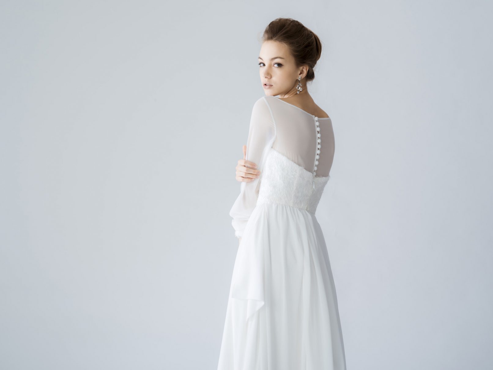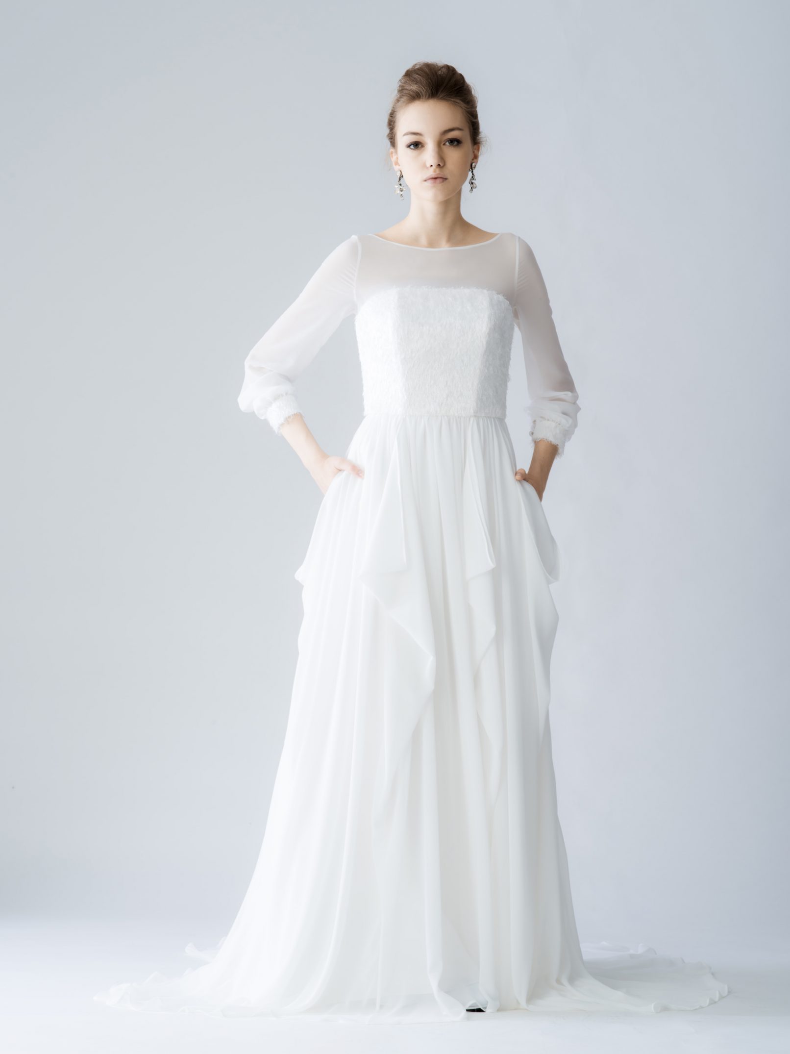 シフォンのドレープスカートに、袖ありポケットが付いた