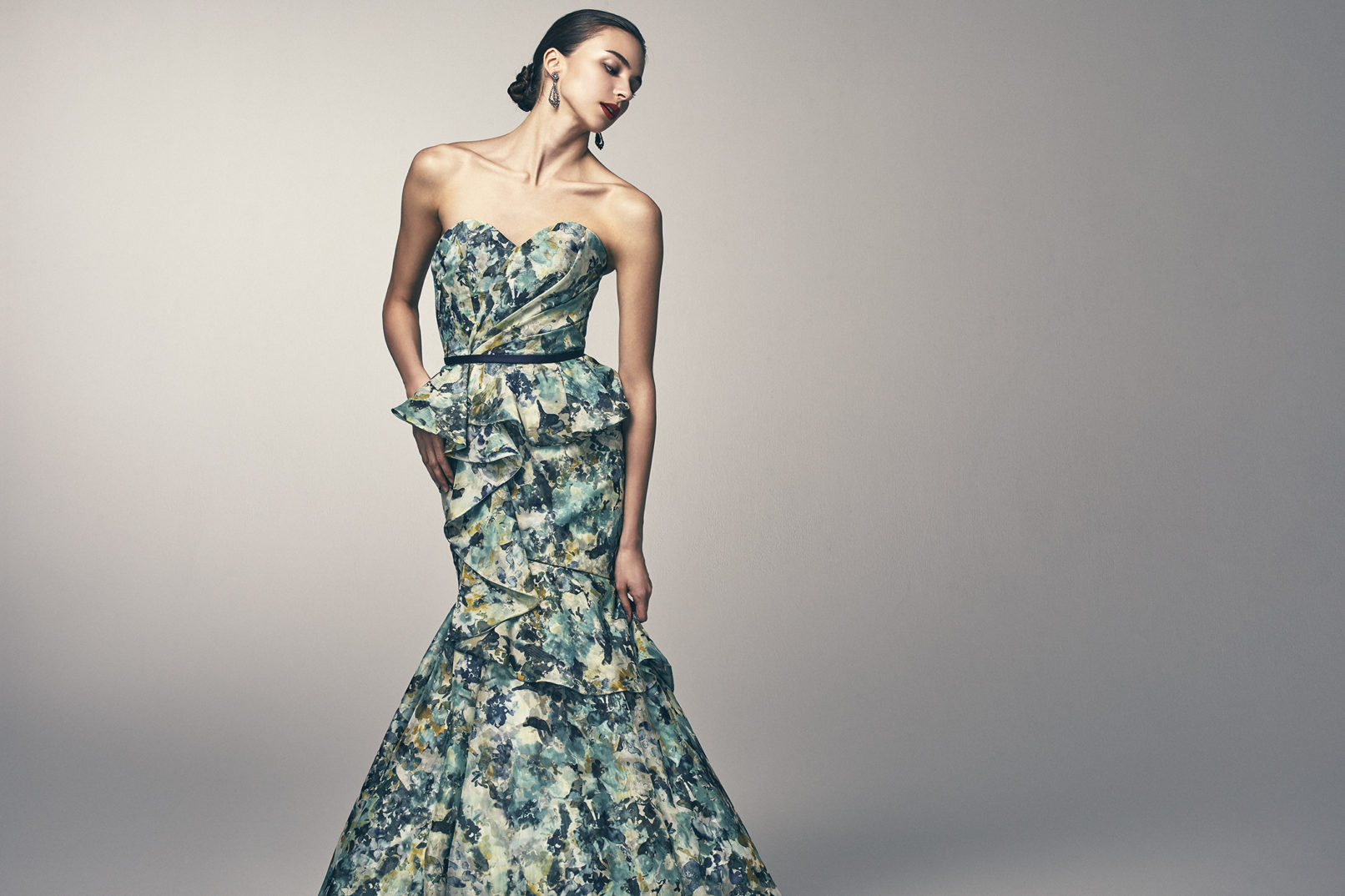 鮮やかながら落ちついた雰囲気の柄とデザインによってマーメイドのハードルを下げ、どんな花嫁にも似合うマーメイドドレスとなっている