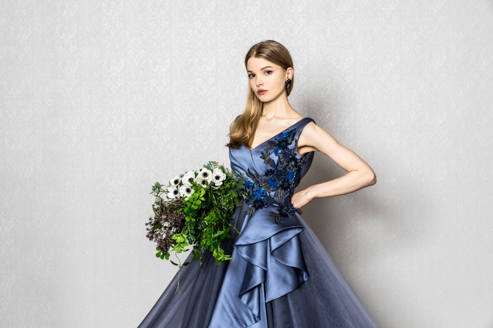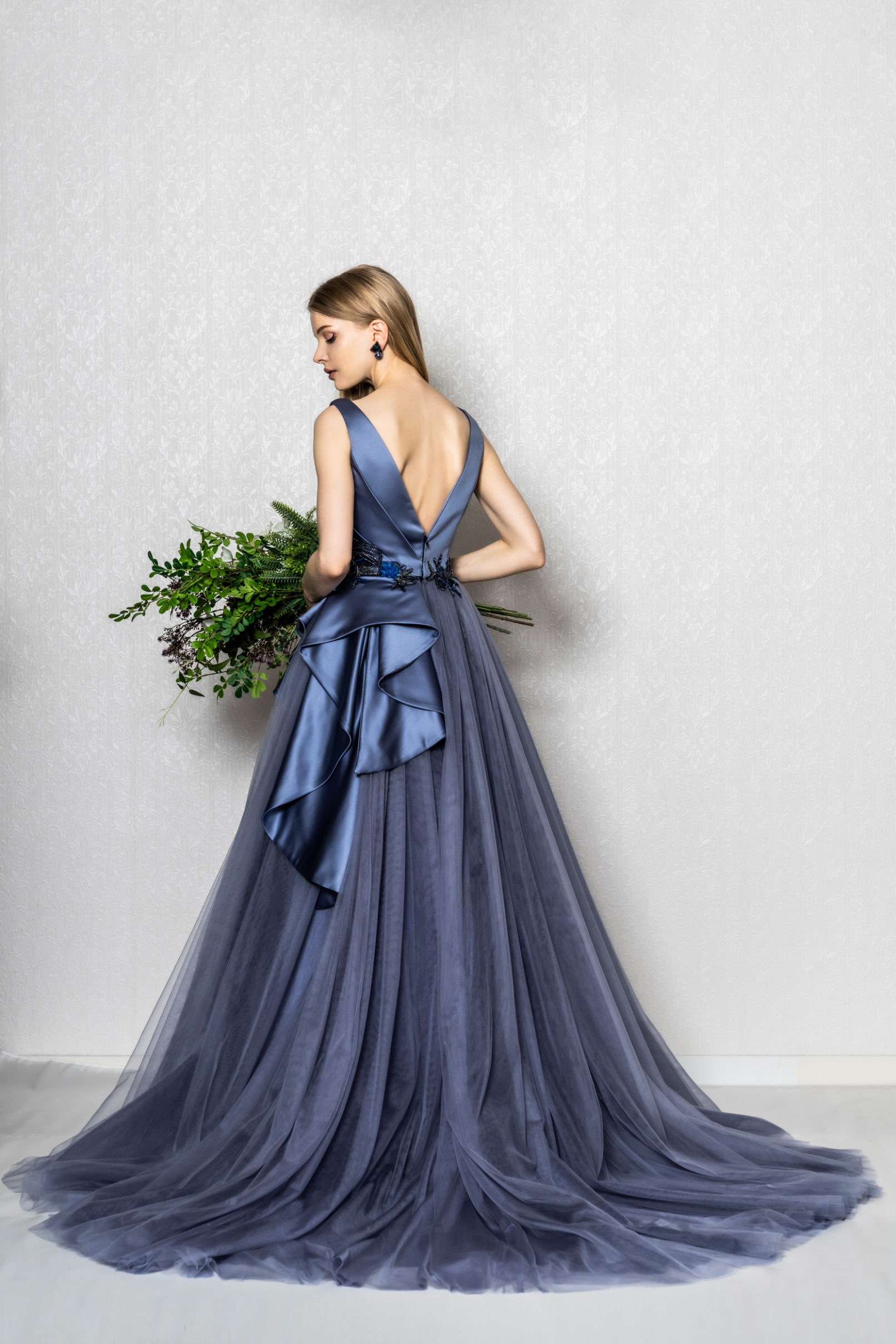 アッシュブルーのビジューチュールドレス ショルダーから繋がるドレープ身頃とインポートビジュー、立体的なスカートディテールが映えるカラードレス。 KS-041『ART CLAIR』のカラードレス単体ver。